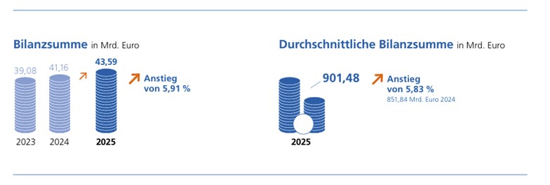 Auf Basis der durchschnittlichen Bilanzsumme (dBS) verbesserte sich der Zinsüberschuss geringfügig auf 2,08 Prozent. Der Provisionsüberschuss lag mit 0,60 Prozent dBS leicht unter Vorjahr, der Verwaltungsaufwand stieg moderat auf 1,55 Prozent dBS. Das Be triebsergebnis vor Bewertung blieb mit 1,20 Prozent dBS stabil leicht über dem Vorjahresniveau. Nach Bewertung ergab sich ein Betriebsergebnis von 1,03 Prozent dBS. Insgesamt bestätigen die Kennzahlen eine robuste Ertragsbasis – trotz sinkender Zinsdynamik und anhaltender Investitionen in Transformation und Qualifizierung. Die Personalaufwendungen bleiben ein Treiber der Kosten: Die Zahl der Beschäftigten erhöhte sich auf rund 6.500 Mitarbeitende (Vorjahr: 6.343). „Die Kostenentwicklung im Personalbereich bleibt herausfordernd. Neben den tarifvertraglichen Anpassungen verursachen Qualifikation, Digitalisierung und Recruiting erhebliche Mehraufwendungen – sind aber entscheidend für eine zukunftsfähige Bankenlandschaft“, erklärte Johannes Freundlieb.