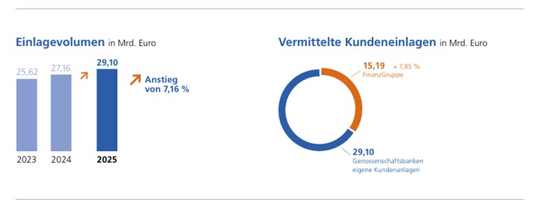 Ein zweiter Stabilitätsanker ist die Entwicklung auf der Passivseite: Die eigenen Kundeneinlagen nahmen um gut sieben Prozent auf 29,10 Milliarden Euro zu. Die vermittelten Einla gen, vor allem Fondsanlagen und Bausparverträge, wuchsen ebenfalls kräftig auf 15,19 Milliarden Euro (plus 7,85 Pro zent). „Dass Kredite und Einlagen im Gleichklang wachsen, zeigt die Stärke des genossenschaftlichen Geschäftsmodells. Die Banken bleiben wichtige Stabilitätsanker – und das Geld der Region bleibt in der Region“, so Schwengels.